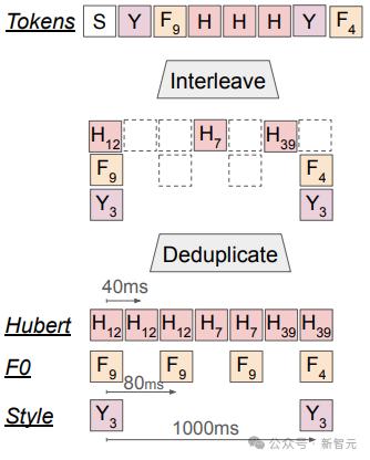 将三种类型的标记(每秒25次的HuBERT标记、每秒12.5次的音高标记和每秒1次的风格标记)按照对应的时间戳进行排序,混合成一个单一的token序列。