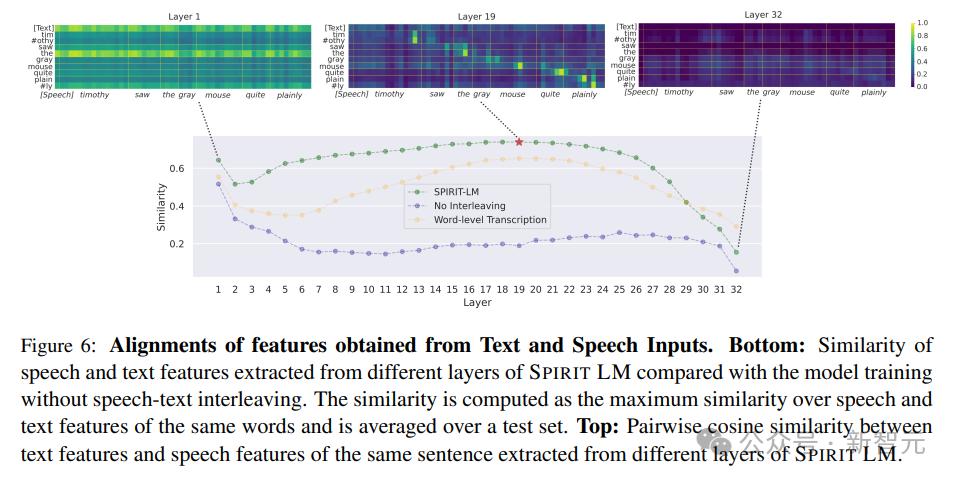 为了更好地理解模型在仅在交错数据和原始语音和文本上训练的情况下,如何实现良好的跨模态性能的隐藏机制,研究人员查看了模型特征的token级相似性,其中特征来自于HuBERT token的输入序列和相应的BPE token,计算了从不同层提取的语音和文本特征的相同单词的最大相似性。