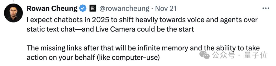 或许等到明年,和Chatbot的主要交流方式,就要从文字对话转为语音和agent了。Live Camera可能就是开始,你觉得呢?