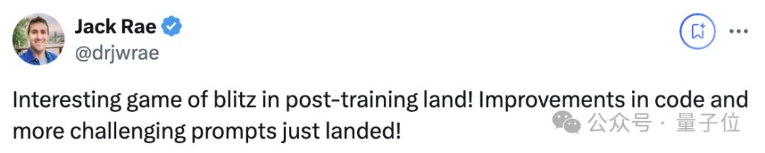 谷歌DeepMind首席科学家Jack Rae,称这是一场有趣的后训练“闪电战”。暗示post-training的迭代速度要比预训练快得多。