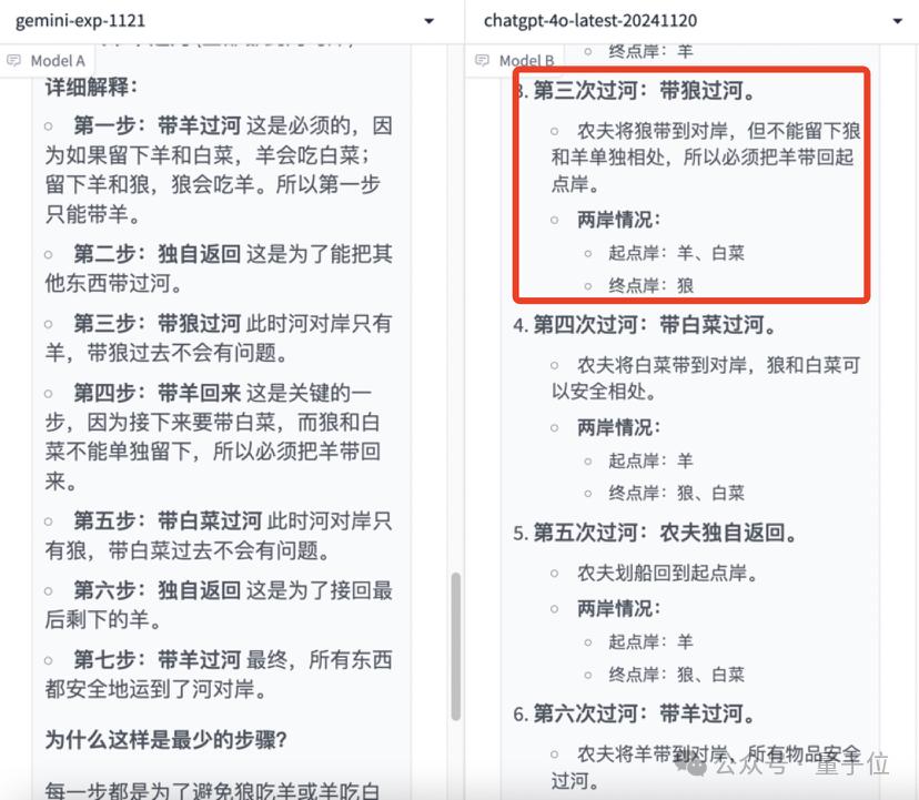 在经典的动物过河逻辑推理题上,Gemini-Exp-1121回答完全正确,新版4o出现了一些失误,把第三次过河和第四次过河合并了,因此回答有误。