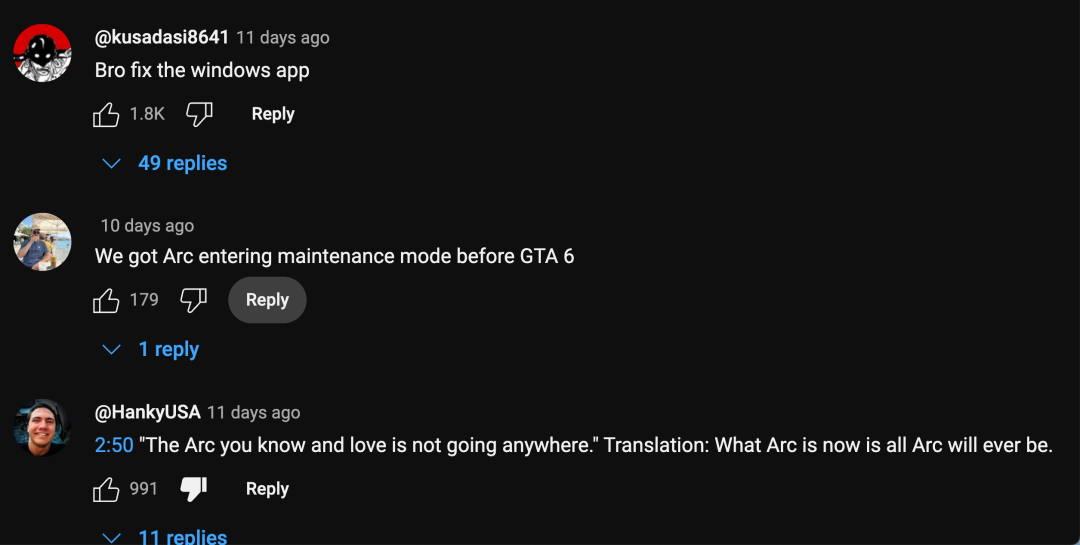 在 Josh Miller 发布的视频评论区,高赞评论几乎全是关于吐槽这份宣言,因为它等同于将 Arc 浏览器宣判死刑:即使是当下,Arc 也并没有做到真正意义上的完美,它还有着众多的问题需要修补。