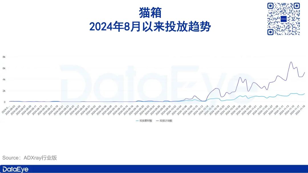 猫箱、即梦也分别在今年3月份、8月份开始买量投放。其中,猫箱自10月份起投流逐步攀升,进入高峰期;