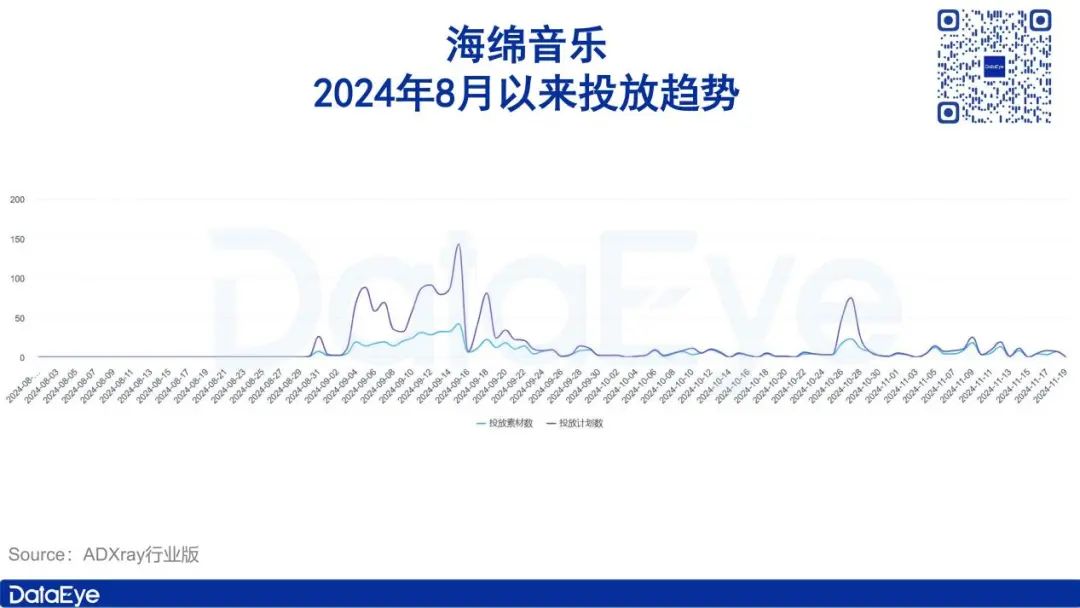 ADX行业版数据则显示,海绵音乐于今年8月份开始买量投放,进行市场推广。其中9月上、中旬为投流高峰期,之后回落并稳定在低位。