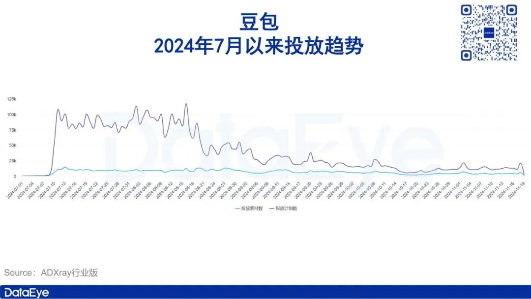 ADX行业版数据显示,2024年7月至今,豆包始终保持着较高的投流力度。其中,7月中旬至8月中旬为买量高峰期,之后滑落并稳定在相对低位。