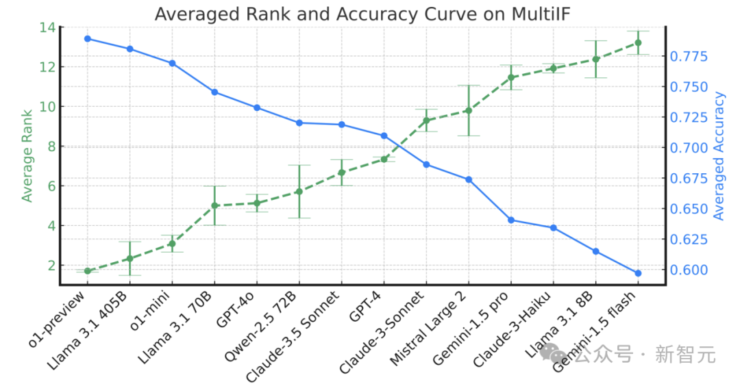 在 Multi-IF 基准上,Meta 团队对 14 种最先进的大语言模型(LLMs)进行了评估,涵盖了 OpenAI 的 o1-preview、o1-mini,GPT-4o,Llama 3.1(8B、70B 和 405B),Gemini 1.5 系列,Claude 3 系列,Qwen-2.5 72B,以及 Mistral Large 等。