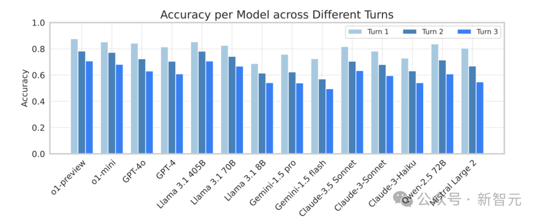 例如,表现最佳的 o1-preview 模型在第一轮指令的平均准确率为 87.7%,但到第三轮下降至 70.7%