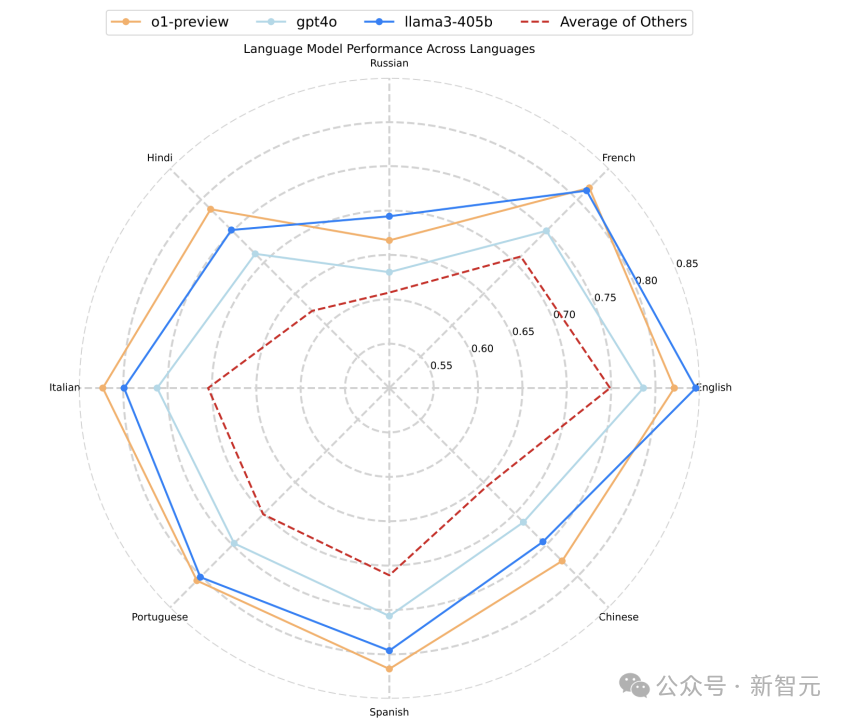 实验结果还表明,不同模型在多语言指令遵循中的表现存在一定差异。o1-preview 在所有语言中的表现相对稳定,并在中文、西班牙语、意大利语和印地语中稍胜 Llama 3.1 405B,而 GPT-4o 的表现则略逊于前两者。