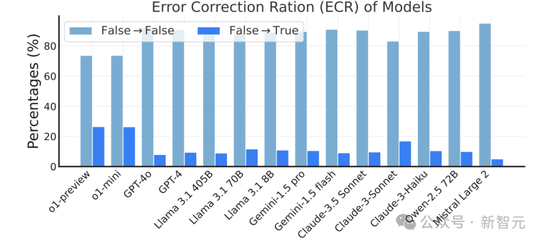 模型在多轮任务中是否能够纠正之前的错误也是一个重要的性能衡量标准,实验通过计算「错误自我修正率」(Error Correction Ratio, ECR)来评估这一能力。