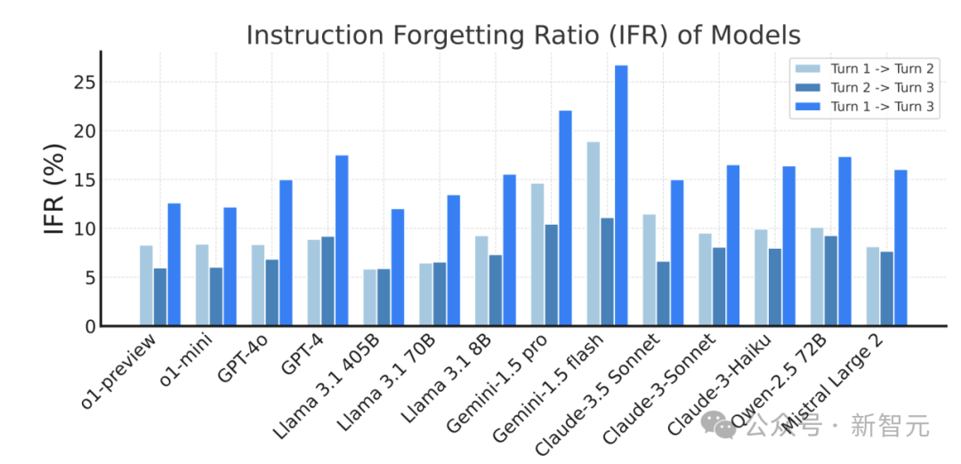 IFR 值表明,高性能模型如 o1-preview 和 Llama 3.1 405B 在多轮对话中的遗忘率相对较低,而有些模型比如 Gemini 在 IFR 值上明显偏高,表现出较高的指令遗忘倾向。