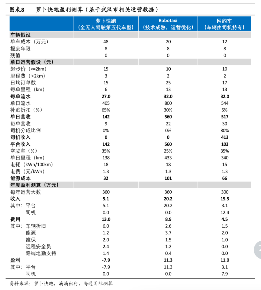 其中萝卜快跑主要以当前的第五代车型为主,Robotaxi则假设车辆成本为20万元。测算条件包含车辆成本、费用计价、运营时长、运营费用等几个方面,最后得出来的结果是,萝卜快跑第五代车型在补贴折扣65%的情况下,一年将亏损7.9万元,而Robotaxi和网约车则是盈利11.3万元和11万元。