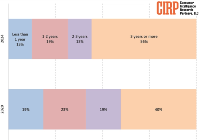CIRP最新的数据也显示,高净值用户占大多数的iPhone用户,换机周期也在持续延长,在最近12个月中,至少71%的iPhone用户和68%的Mac用户表示,他们的旧设备使用时间已超过两年,相比2020年的63%和59%,这一比例有显著增长。