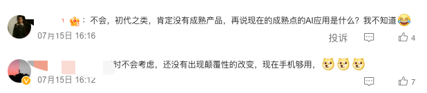 也有网友认为,目前虽然各种大模型,但还没有出现颠覆性的改变。「暂时不会考虑,还没有出现颠覆性的改变,现在手机够用」