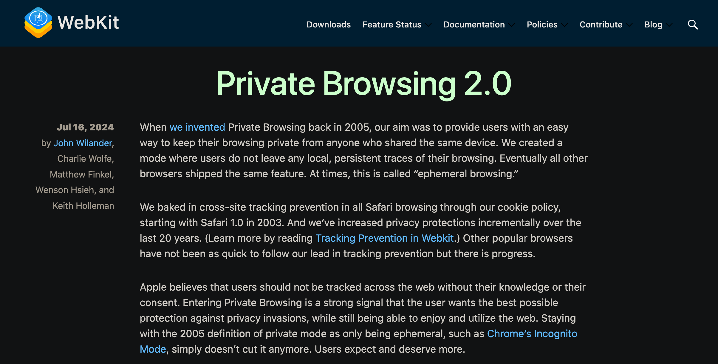 7 月 16 日,苹果在 WebKit(iOS/iPadOS 平台的默认浏览器内核)的博客上发布了一篇文章,名为《隐私浏览 2.0》。