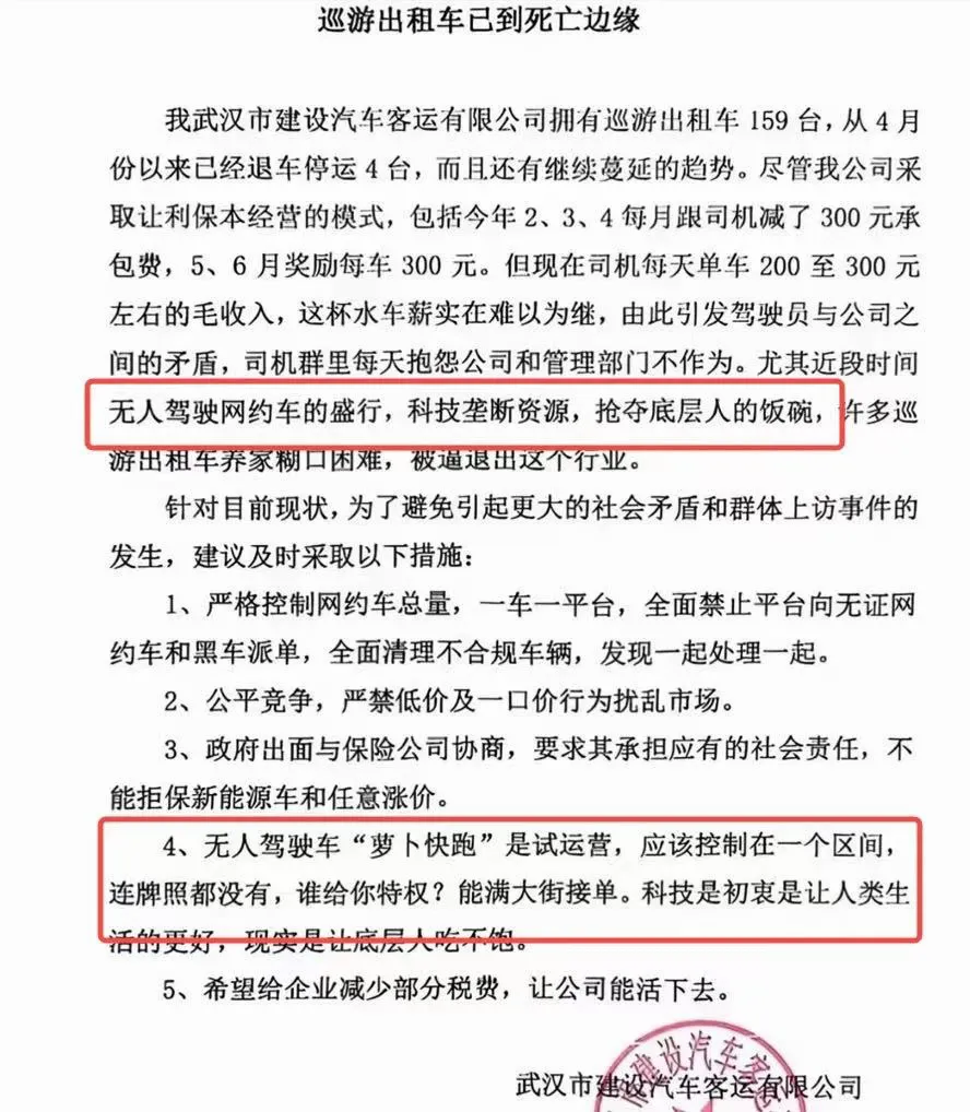 如此对比下,让不少司机产生了危机感。日前,一张以《巡游出租车已到死亡边缘》的网传图片,将这一话题的讨论度推至了巅峰。在这张落款为武汉市建设汽车客运有限公司的声明截图中,写道:“无人驾驶车萝卜快跑是试运营,应该控制在一个区间……科技的初衷是让人类生活的更好,现实是让底层人吃不饱。”