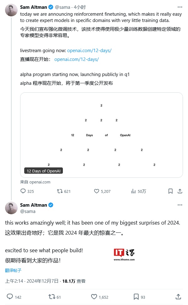 OpenAI 首席执行官山姆・阿尔特曼(Sam Altman)表示:“强化微调,效果出奇地好;它是我 2024 年最大的惊喜之一。”