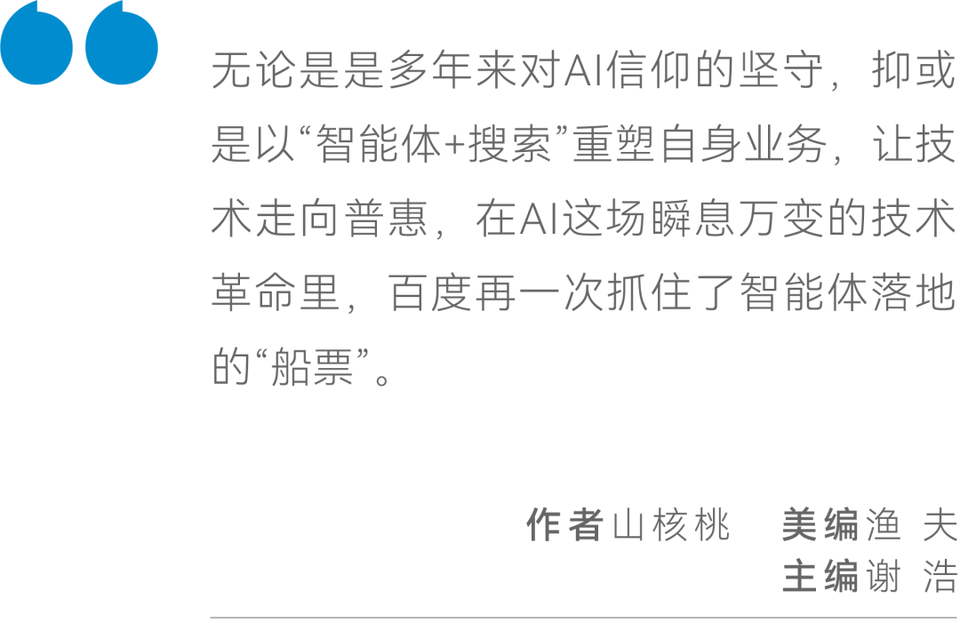 而无论是长期主义和理想主义下,多年来持续对AI信仰的坚守,抑或是现实主义下以“智能体+搜索”重塑自身业务,让技术走向普惠,在AI这场瞬息万变的技术革命里,百度再一次抓住了智能体落地的“船票”。