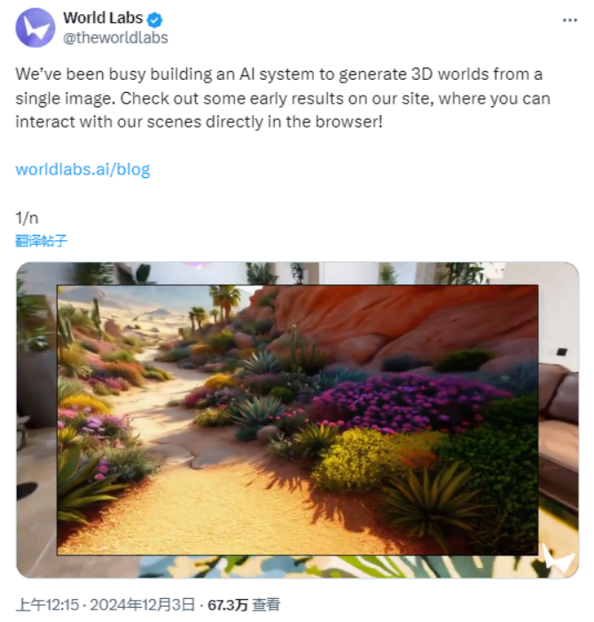 作为AI领域影响力最大的女性和华人之一,斯坦福大学教授李飞飞于当地时间12月2日公布了其首个创业项目World Labs的成果——能用单张静态图片生成3D世界的AI产品。