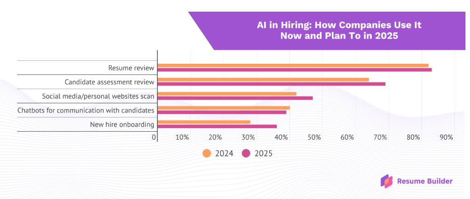 其中,82% 的公司使用 AI 来审查简历,而 40% 的公司使用 AI 聊天机器人与候选人交流。大约 23% 的公司使用 AI 进行面试,64% 的公司使用 AI 来审查候选人评估。