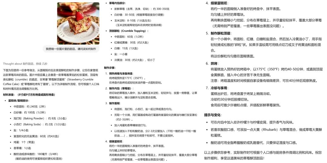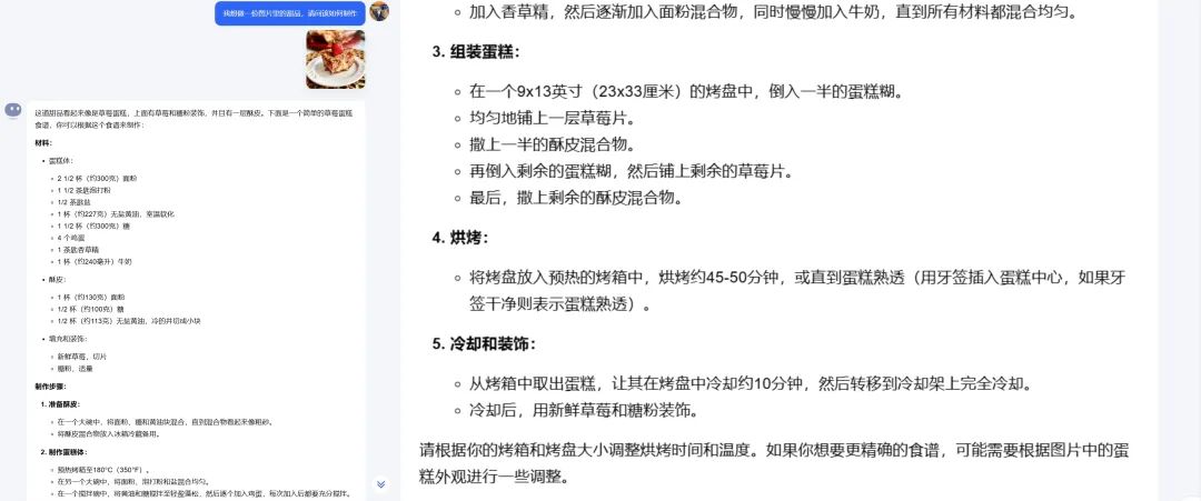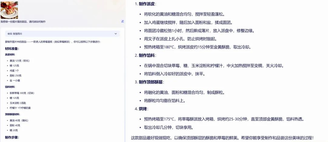 所以,我又出了一道附加题,从网络上搜索了一个草莓馅饼的照片,然后询问AI如何制作照片里的甜点。