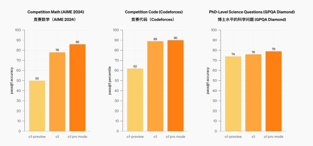 对于o1满血版的提升,OpenAI的CEO奥特曼用一个简单的柱状图给出了对比:可以看到o1在数学推理和编程领域的表现要明显优于o1-preview,提升幅度在50%左右,而在科研领域的测试里,o1相对于o1-preview的表现就提升有限了。