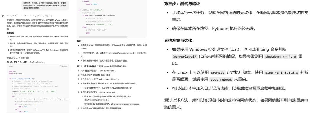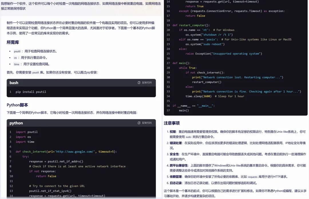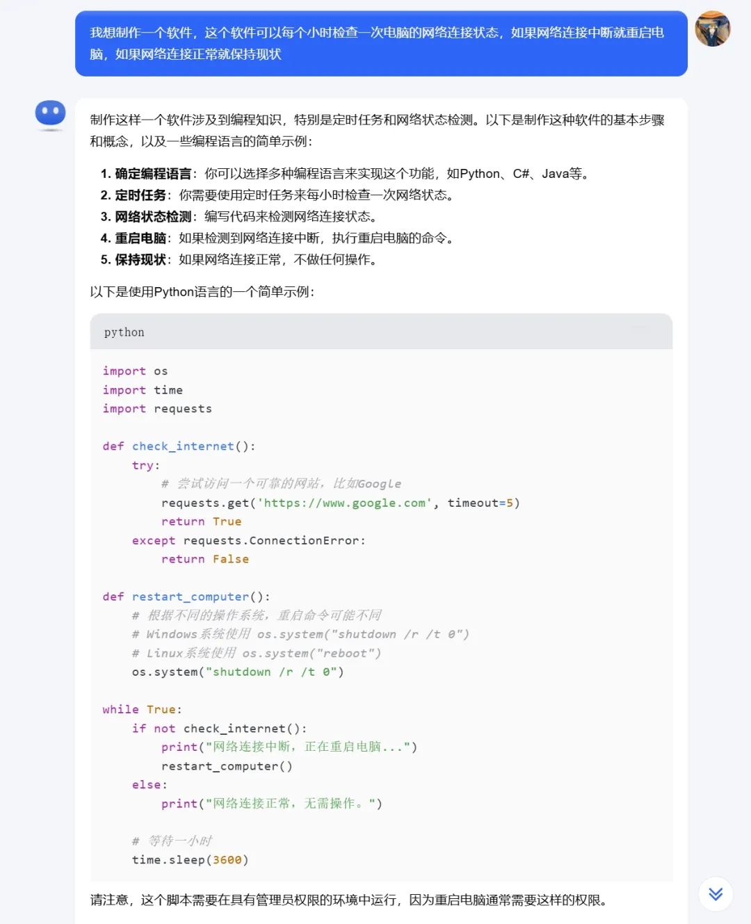 我想制作一个软件,这个软件可以每个小时检查一次电脑的网络连接状态,如果网络连接中断就重启电脑,如果网络连接正常就保持现状