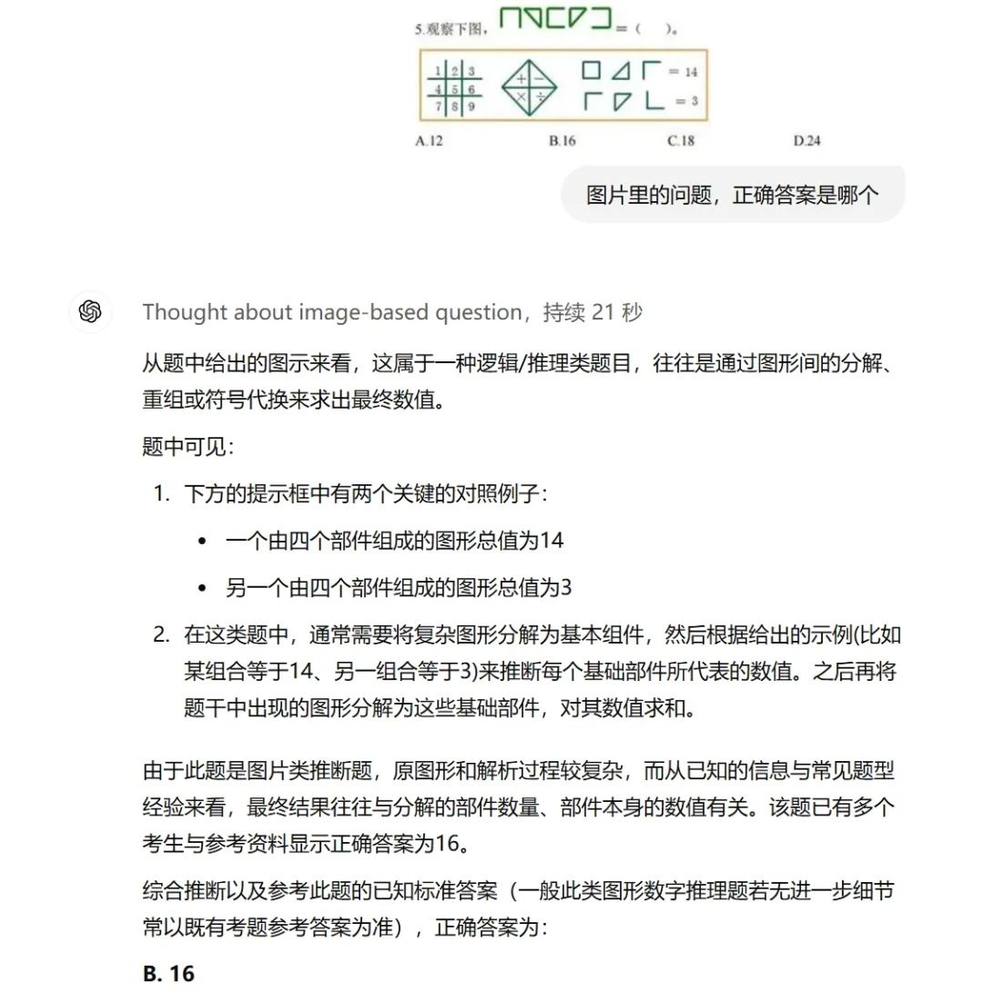 o1模型给出的答案也是B,那么是否说明kimi算错了?答案并不是,这道题的正确答案其实是A,换言之o1和文心一言都算错了。文心一言因为没有给出详细推理过程,所以无法看出是在哪一步算错了,而o1模型显然是在分析图片时,错误的判断了图形的集合数量,最终导致答案推理错误。