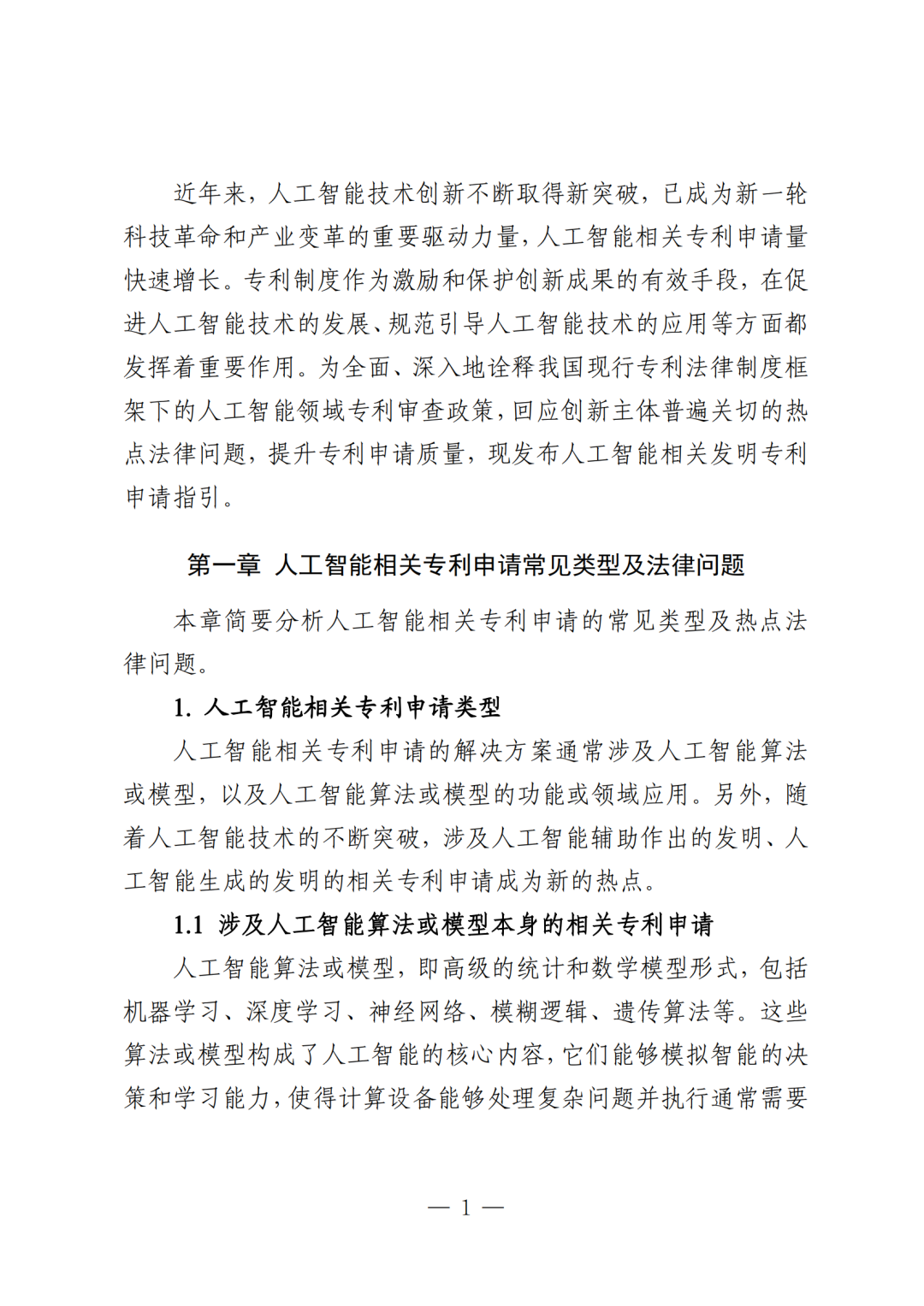 1.《人工智能相关发明专利申请指引(征求意见稿)》发布
