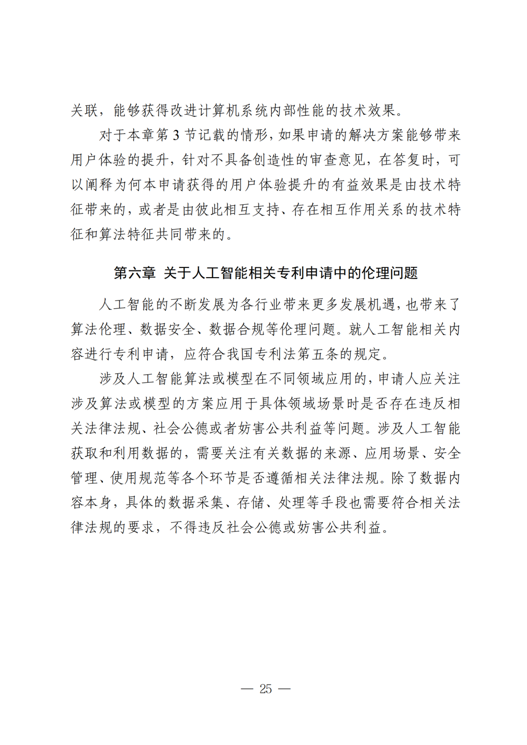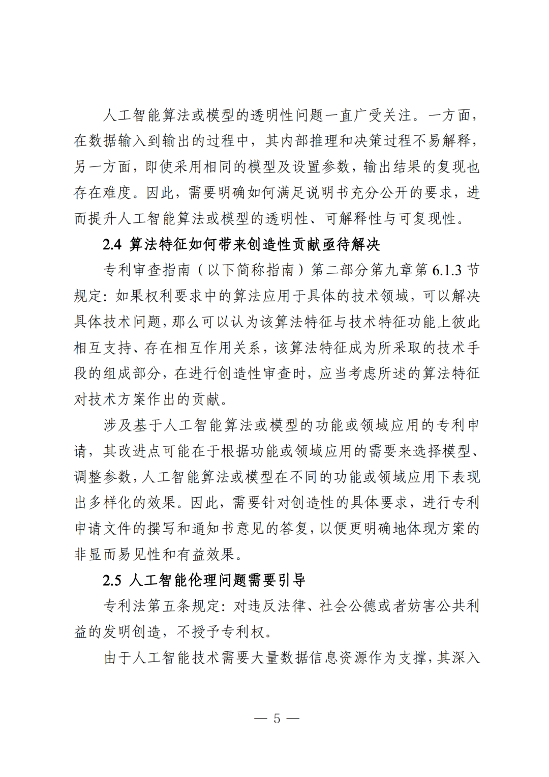 《征求意见稿》共六章,归纳了人工智能相关专利申请的常见类型及法律问题,涉及发明人身份的认定问题、方案客体的标准、说明书的充分公开问题、创造性的考量等内容,并提供了关于人工智能伦理的指引性意见。