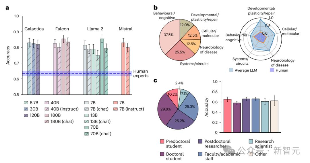 在BrainBench上,大型语言模型的性能表现都超过了人类专家,平均准确率为81.4%,而人类专家的平均准确率为63.4%;当把人类回答限制在那些自报专业水平在前20%的测试项时,准确率上升到了66.2%,但仍然低于大型语言模型的水平。