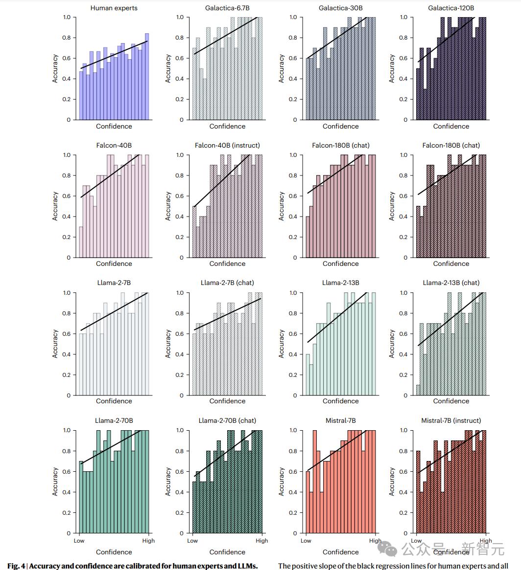 为了评估大型语言模型的预测是否经过校准,研究人员检查了置信度与准确性之间的关联性,结果发现与人类专家一样,所有大型语言模型都展现出准确性和置信度之间的正相关性。