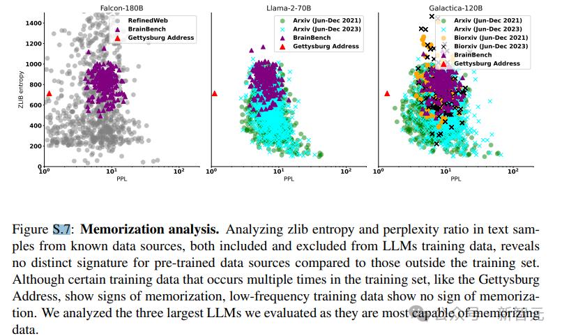 在测试时,为了防止基准测试本身可能是训练集的一部分,研究人员采用zlib-perplexity ratio(困惑度比率)来评估大型语言模型是否记住了某些段落。