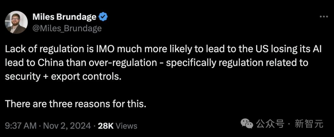 尽管他表示,「AI监管措施」与「国家竞争力」之间并不存在大多数人所认为的那种联系,但他发表过的一篇推文直言:「与过度监管相比,缺乏监管,特别是与安全+出口管制相关的监管,更有可能导致美国失去AI领域的领先地位」