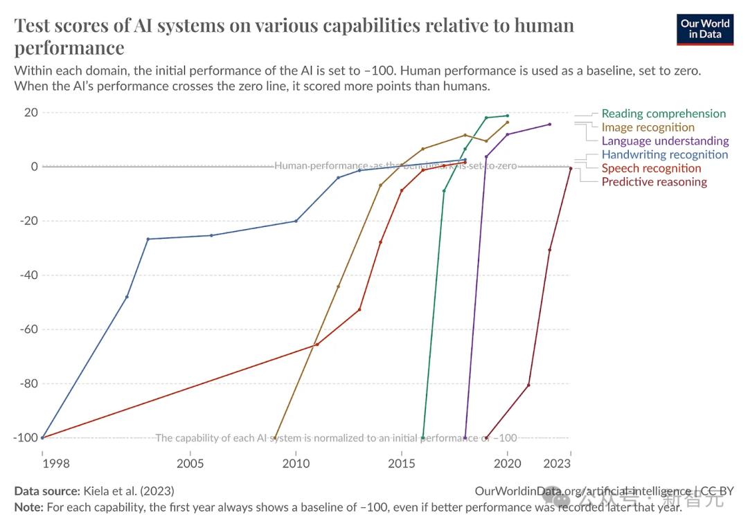 另外还有下面这张著名的图表,告诉我们AI的发展如何让各种评估基准越来越快地饱和。