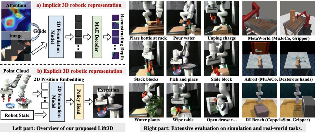 图 1: 为了赋予大规模 2D 预训练模型 3D 操控能力, Lift3D 首先通过 mask 任务相关的 affordance 区域和深度重建,以提升隐式 3D 机器人表示;随后通过利用预训练的 2D 位置嵌入来直接编码 3D 点云数据,进行显式 3D 操纵模仿学习。Lift3D 在各种仿真(i.e., 机械臂,灵巧手)和现实世界任务中展现出强大的鲁棒性和令人惊讶的效果