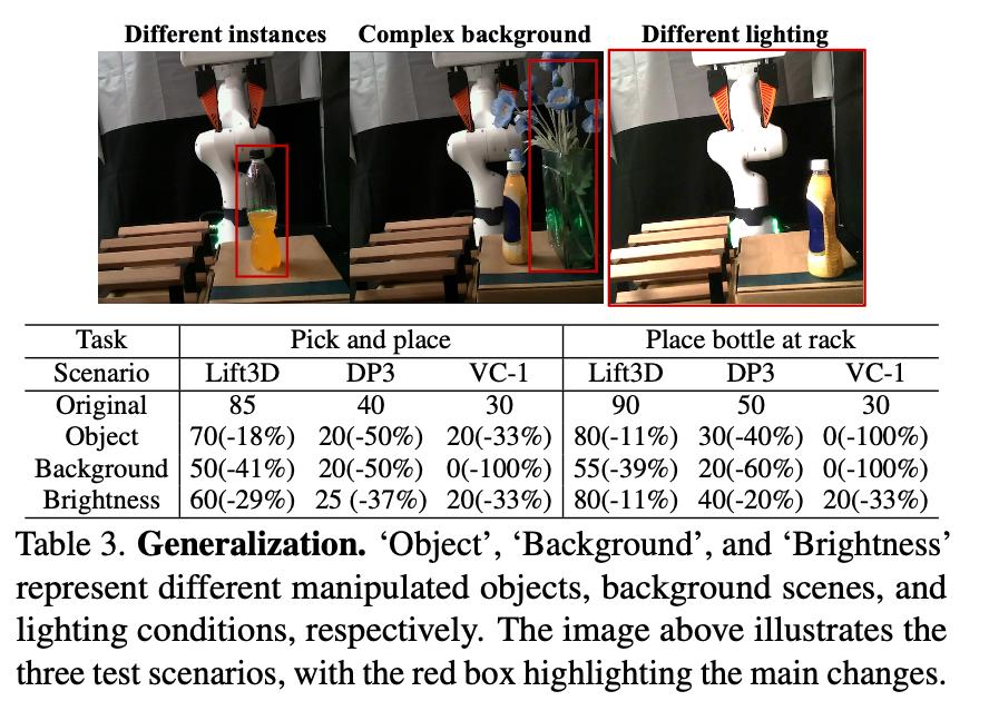 光照变化不仅会影响 2D 图像的数据分布,还会影响深度捕捉,从而影响点云数据。在光照变化的影响下,Lift3D 仅表现出约 20% 的准确度下降,充分展示了其强大的 3D 机器人表示能力。