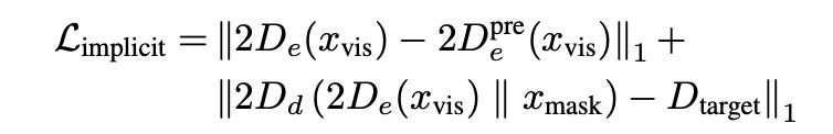3. 为了保持基础模型的固有能力,引入蒸馏损失,约束可见标记输出和原本 2D 预训练模型中对应特征之间的距离。在第一阶段的训练过程中,我们通过重建和蒸馏损失来微调注入的适配器和解码器,损失函数公式为: