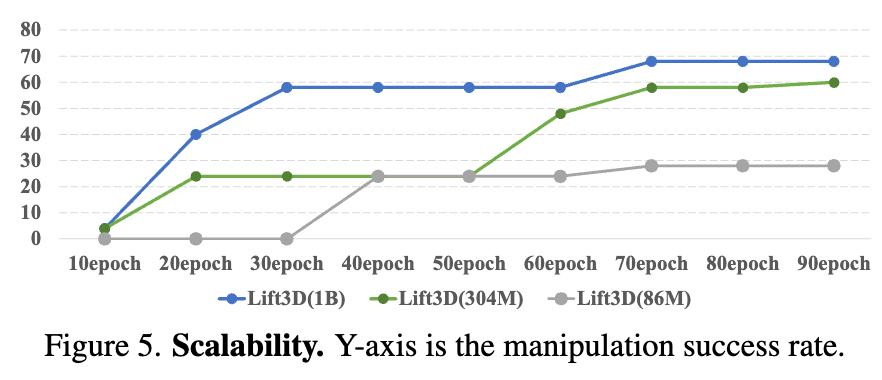 在计算机视觉中,2D 基础模型通常随着参数规模的增加,能够提升下游任务的表现。基于此,我们研究了我们提出的 Lift3D 策略是否也具有可扩展性。我们在非常困难的 MetaWorld 仿真任务 “shelf-place” 上进行了实验。在这个复杂任务中,Lift3D(DINOV2-ViT-base)仅达到 28 的准确率。ViT-base 的参数量只有 86M,而 ViT-large 和 ViT-giant 的参数量分别为 304M 和 1B。通过将 2D 基础模型替换为 DINOV2-ViT-large 和 DINOV2-ViT-giant,Lift3D 在 “shelf-place” 任务上的准确率分别提高到 60 和 68,并且收敛速度更快。这些改进表明,Lift3D 策略模型具有良好的可扩展性,且随着更大规模的 2D 基础模型,Lift3D 框架能够生成更鲁棒的操作策略。