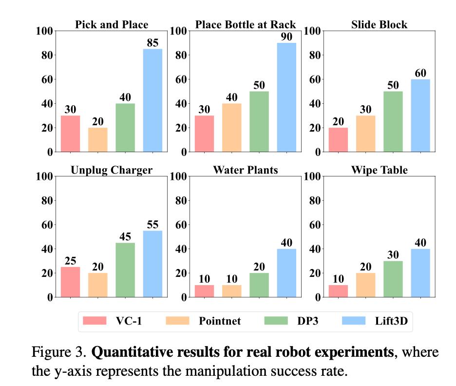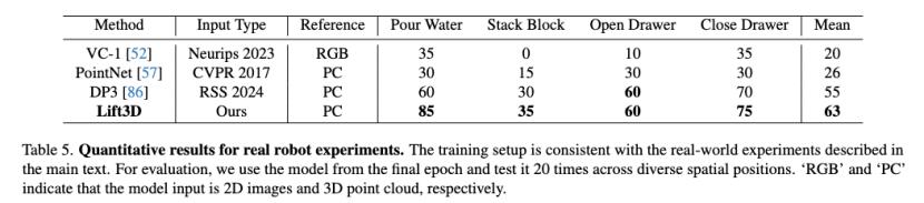 如下图和下表所示,我们将 Lift3D (CLIP) 与 DP3、VC-1 和 PointNet 进行比较。结果表明,Lift3D 在多个任务中表现一致且良好。特别是在 “将瓶子放到架子上” 任务中,该任务要求精确的 3D 位置和旋转预测,Lift3D 达到了 90 的成功率。结果表明,Lift3D 能够有效理解 3D 空间场景,并在现实世界中做出准确的位姿预测。对于复杂任务 “擦桌子”,由于需要操纵可变形的物体,所有方法在精度上都面临限制。尽管如此,Lift3D 仍然达到了 40 的成功率。