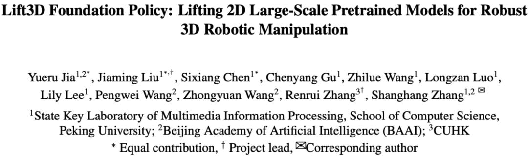 论文标题:Lift3D Foundation Policy: Lifting 2D Large-Scale Pretrained Models for Robust 3D Robotic Manipulation