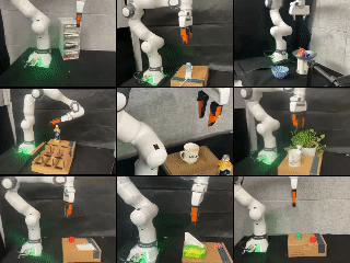 在真机实验设置中,我们使用 Franka Research 3 机械臂,并通过 Intel RealSense L515 RGBD 相机捕捉静态前视图。实验包括 10 种任务:1)将瓶子放到架子上,2) 倒水,3) 拔掉充电器,4) 堆积积木,5) 捡起并放置物体,6) 滑动积木,7) 浇水,8) 擦桌子,9) 打开抽屉,10) 关上抽屉。对于每个任务,我们在不同的空间位置收集了 40 次演示,轨迹以 30 fps 进行记录。我们选择了 30 次实验并提取了关键帧,用以构建每个任务的训练集。