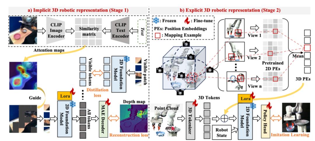 图 2: Lift3D 的整体流程。a) 对于隐式 3D 机器人表示,我们利用 CLIP 离线提取基于任务描述的图像注意力图,并将其反向投影到 2D 输入图像上,以指导 MAE 的掩码。然后,我们将可见的 tokens 输入 2D 基础模型进行特征提取。掩码 tokens 和编码后的可见 tokens 经过 MAE 解码器进行深度重建,从而增强 3D 空间感知。同时,编码后的可见 tokens 还会通过与原模型的特征进行蒸馏,以减轻灾难性遗忘问题。b) 对于显式 3D 机器人表示,我们首先将点云数据投影到多个虚拟平面上,建立 3D 输入点与每个虚拟平面上的 2D 位置嵌入(PEs)之间的位置映射。映射完成后,我们将每个 3D 补丁对应的 2D PEs 进行平均,形成统一的 3D 位置嵌入(3D PEs),然后将其与 3D tokens 结合。这些 3D tokens 是通过将点云输入轻量级 3D 分词器生成的。最后,来自 2D 基础模型的输出特征通过策略头进行处理,以预测模仿学习的位姿。