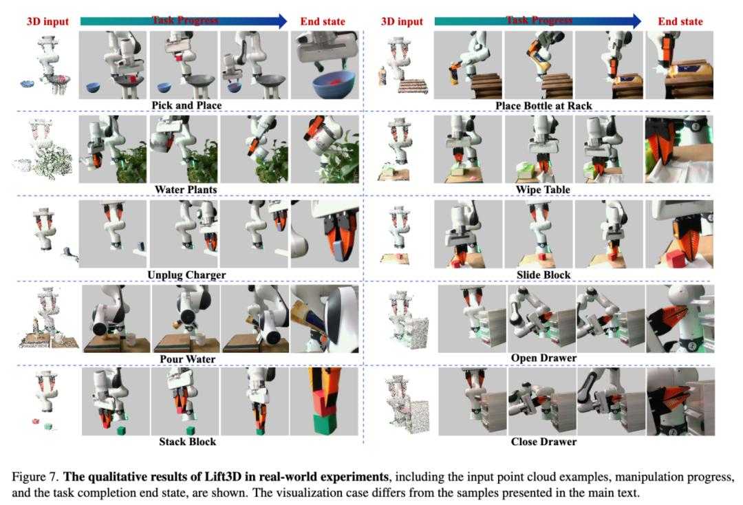 如下图所示,展示了六个真实世界任务的操作过程。本文的方法准确预测了连续的 7 自由度末端执行器姿态,使得任务得以沿着轨迹顺利完成。例如,在 “给植物浇水” 任务中,Lift3D 首先准确抓住了浇水壶的手柄。接着,它平稳地抬起壶并将其定位到植物上方。最后,夹持器逐渐旋转以控制 “水流”。