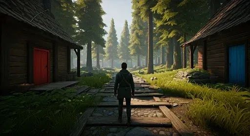 图像由 Imagen 3 生成,prompt:「第三人称开放世界探索游戏的截图。玩家扮演一名正在探索森林的冒险者。左边有一栋房子,门是红色的,右边有一栋房子,门是蓝色的。摄像机位于玩家正后方。