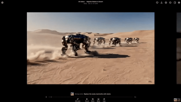 初始视频生成后,用户如果需要优化,可通过remix工具改变物体,比如将猛犸象替换为机器人、更改人物表情等。为此,Sora还设置了细微、轻微、强力三种强度,以满足用户不同的更改需求。