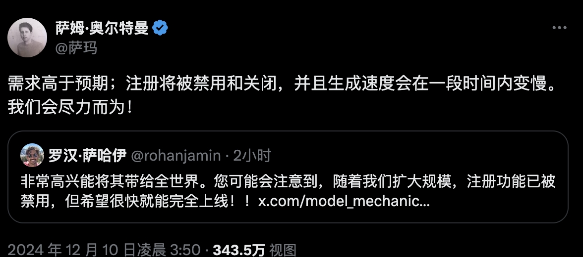 随着Sora开放使用,网友疯狂涌入导致服务器被挤爆。对此,OpenAI创始人兼CEO Sam Altman发文表示,用户注册已被关闭,并且视频生成速度将在一段时间内变慢。