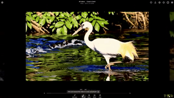 直播中,OpenAI在描述框中输入“一只黄尾白鹤站在小溪里”的指令,将这条视频片段放入时间轴前部分,接着在新视频输入“这只鹤将头探入水中并叼出一条鱼”指令,将其放在同一个时间轴的后部分。两段视频并不连续,因此需要Sora自行生成过渡视频,将两个视频合成为一段完整视频。