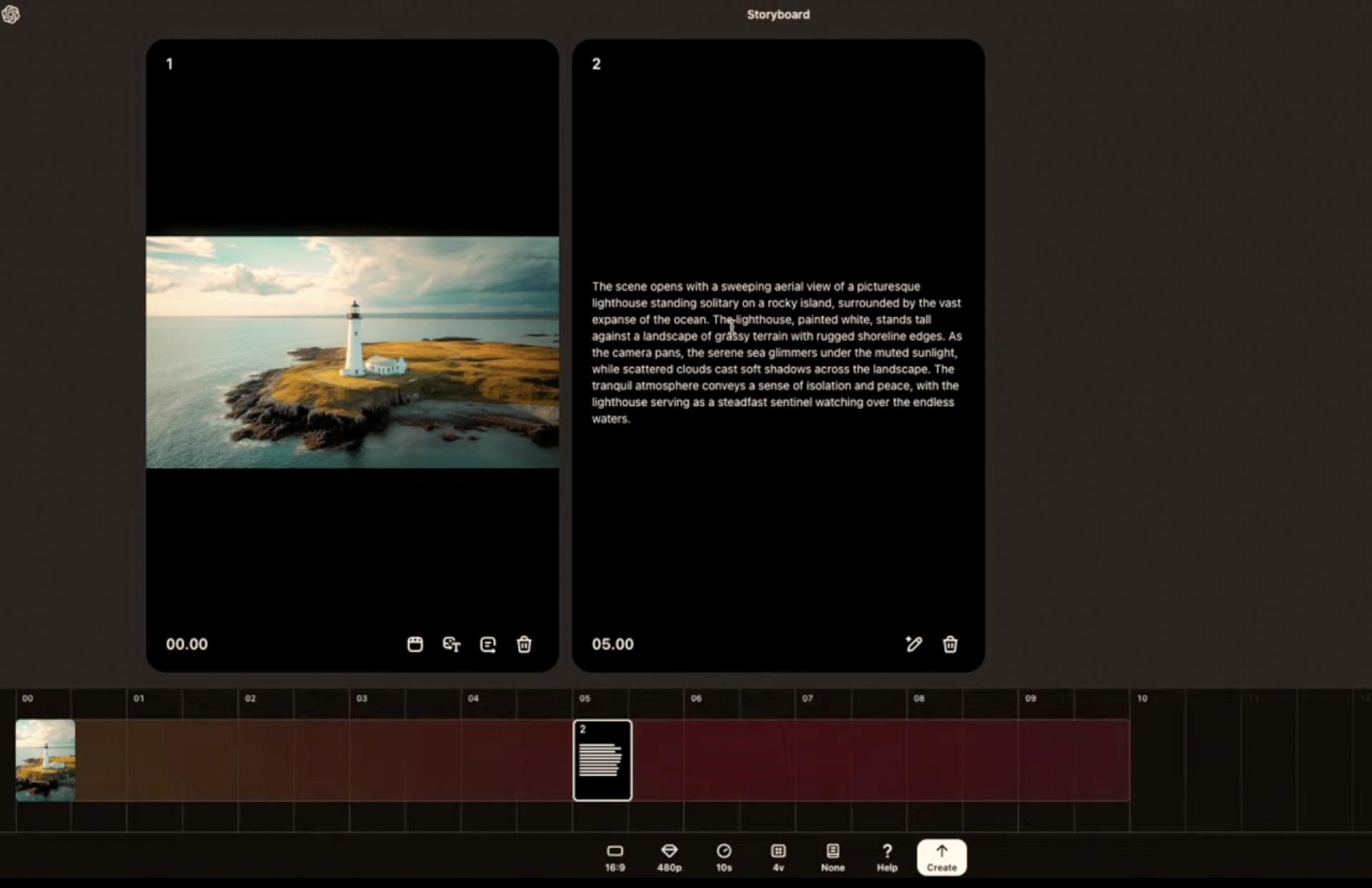 比如,提交一张灯塔的图片后,Sora会在之后创建一张卡片描述后续将生成的视频,用户可以更改指令,并在时间轴调整位置决定生成的视频何时播放。
