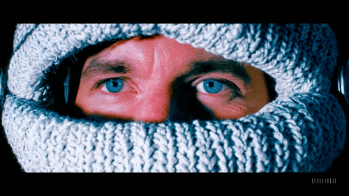 然后来个“针织布面罩框住宇航员的眼睛的详细特写视图”: