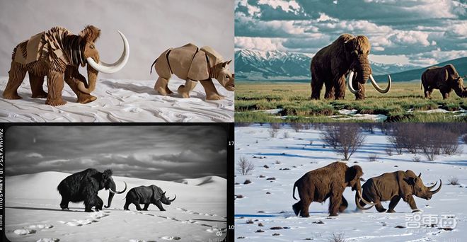 右下角是两个猛犸象在步行的视频,你可以将风格切换成“硬纸板和纸质工艺品”(左上)、“复古电影”(右上)、“怀旧档案”(左下)。